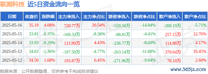 5月16日的资金流向数据方面,主力资金净流入720.77万元,占总成交额20.54%,游资资金净流出520.58万元,占总成交额14.84%,散户资金净流出200.19万元,占总成交额5.71%。